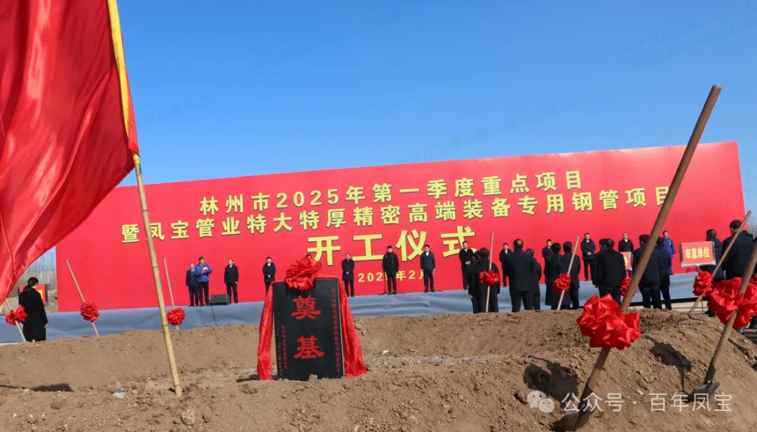 凤宝管业89厂西边场地,红旗招展,音乐欢快,巨大的红色幕墙,挽着红绸的铁锨呈圆形插在奠基石周围,标牌后整齐站立的人群,喜气、庄重的气氛溢满整个现场。“林州市2025年第一季度重点项目暨凤宝管业特大特厚高端装备制造专用精密钢管项目”开工仪式在这里隆重举行。仪式由林州市委副书记、市长田元飞主持。市委书记孙建铎宣布项目开工。